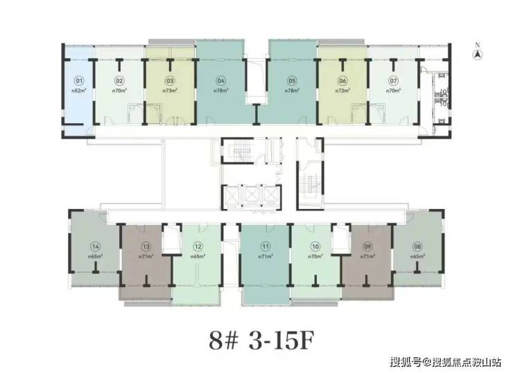 - 在售楼栋:8#楼,15层,50-80㎡, 3梯14户,层高5.4米