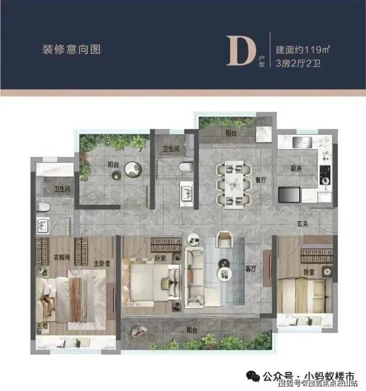 · 119㎡ 3+1房两厅两卫:MAX级超阔尺度观景阳台,强调尺度感,适合追求品质生活的人群