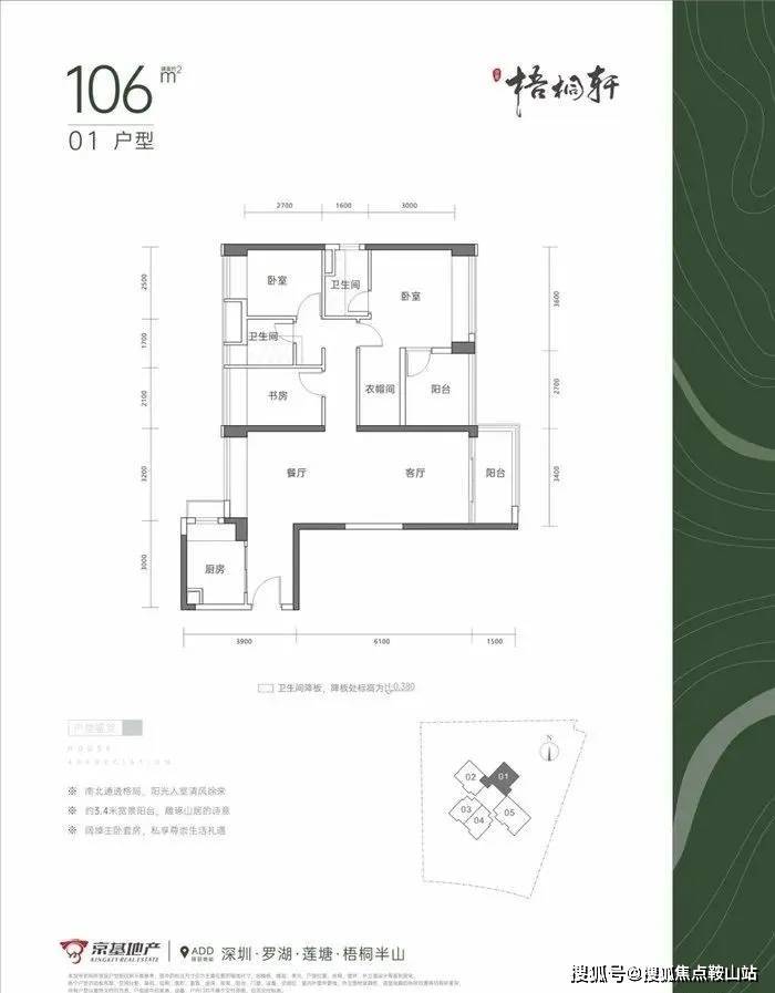 01户型106㎡的4房2厅2卫,竖厅南北通透格局,客厅3.4米开间,客厅阳台主朝东南朝向。