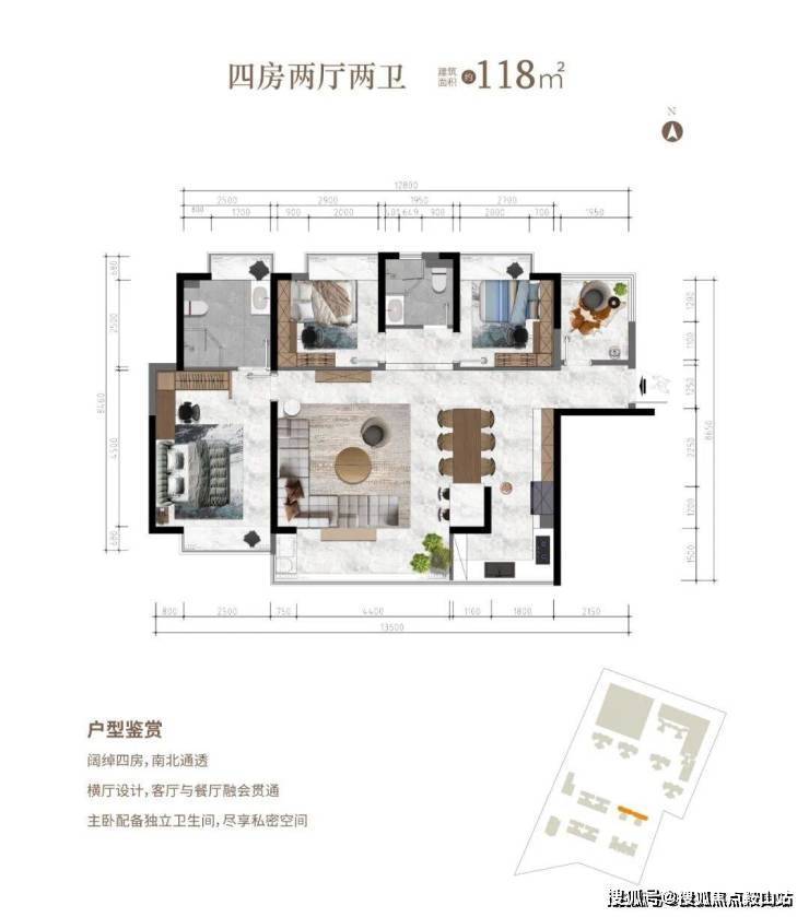 阔绰四房,南北通透2⃣横厅设计,客厅与餐厅融会贯通3⃣主卧配备独立卫生间,尽享私密空间