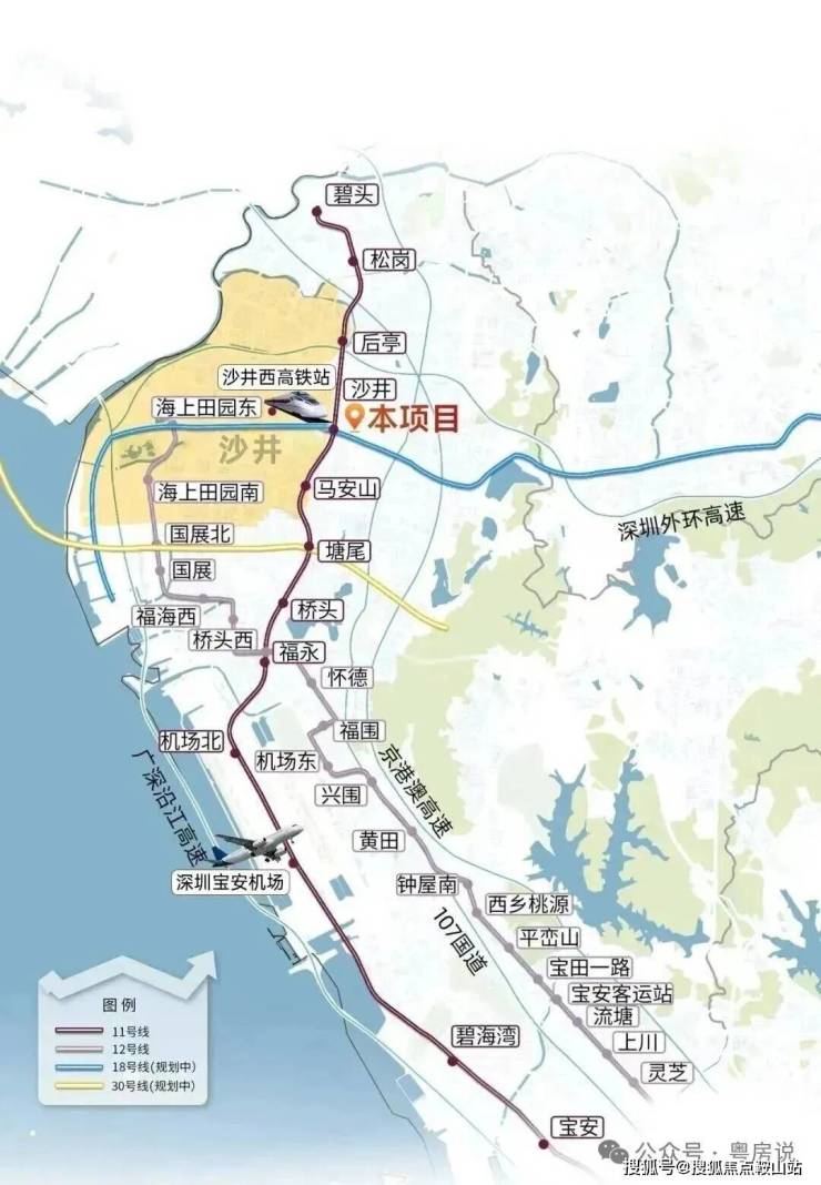 🚇『立体交通 出入繁华快人一步』陆、空、轨多维立体交通网络,勾连起驱动城市前行的澎湃力量。• 地铁直达:约300米(直线距离)11号线沙井站,6站直达宝安机场,8站宝中,9站前海• 主道纵横:广深高速、外环高速,畅达福田CBD、宝安机场• 城际联动:“穗莞深城际”沙井西站,轻松畅达粤港澳大湾区