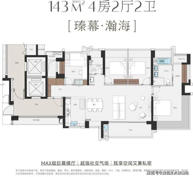 项目主打115-143㎡纯四房,采用4梯5户及专梯入户设计,空间利用率极高。