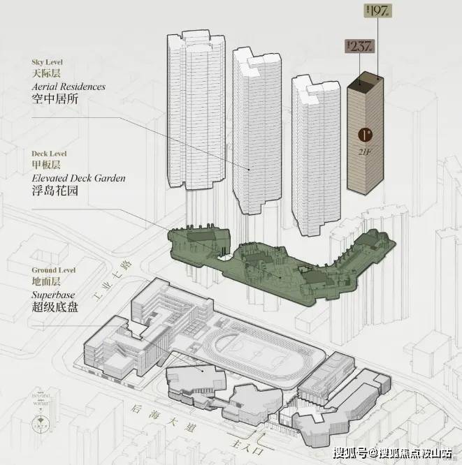 后海招商玺项目采用“浮岛甲板”策略,四栋住宅坐落于抬升的绿化甲板之上,形成“超级社区底盘”与“浮岛绿化甲板”的垂直共生模式,通过“仪式水轴-艺术庭院-空中浮岛森林”三级景观系统,打造“垂直森林社区”,实现建筑与自然的融合。