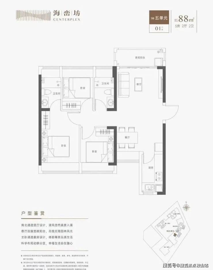 88㎡的3房厅2卫(1栋5单元01户型),设计的是竖厅南北通透格局,LDKB一体化设计,动静分区,四开间朝南,L型厨房,得房率:71.1%(不含赠送),阳台西北朝向。