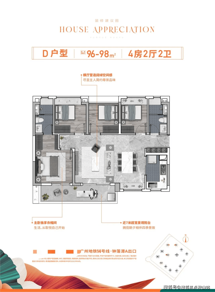 约 98㎡4 房 2 厅 2 卫:横厅设计营造出阔绰的空间感,尽显主人的简约尊崇品味。主卧独享衣帽间,满足主人对品质生活的追求。近 7 米超宽景观阳台,让业主可以拥揽四季景致,享受惬意生活。