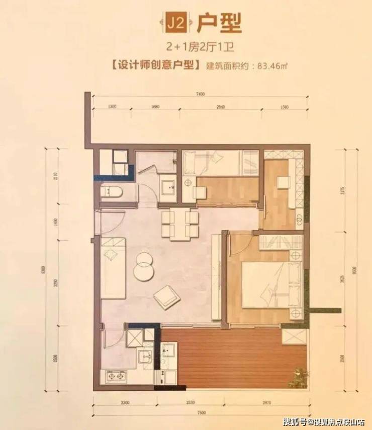 J2户型【83.46㎡】2+1房2厅1卫