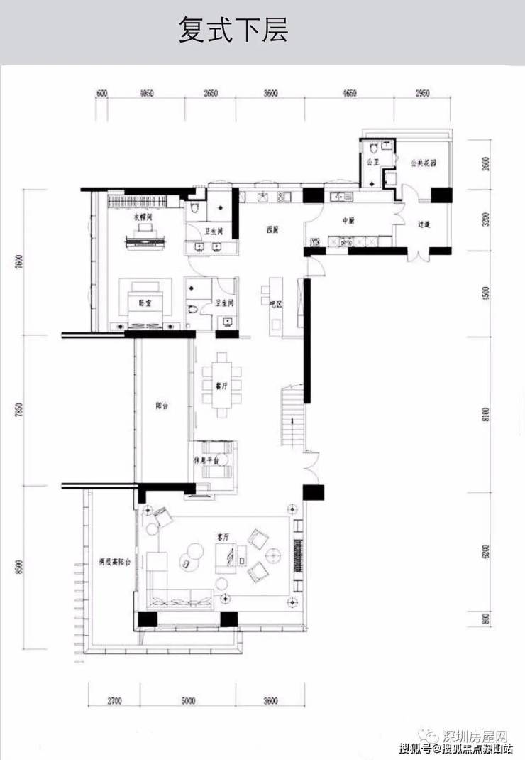 A栋共35套545平米复式5+1房,01西端头户型仅17套珍藏版户型,02东端头户型18套,全部精装交楼,两梯一户,电梯刷卡入户。