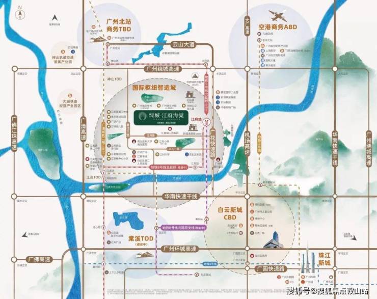 绿城·江府海棠位处广州北部最重要的交通枢纽白云新城北部,项目本身就是集8号线北延段(建设中)、8号线北延段支线(建设中)、空港大道、广清城际和广佛环线等于一体的交通要塞,位于广花路430号上述两条地铁的交会站——江府站双地铁上盖,日后便捷往返越秀和海珠等区,通过接驳广清城际畅达广州火车站。