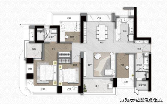 123/126㎡四房两厅两卫:南北通透,约 4.2 米宽厅,LDKB 一体化设计;四开间朝南,六大凸窗 + 设备平台;主卧套房带独立卫浴与 270° 飘窗,适合三代同堂的改善家庭。