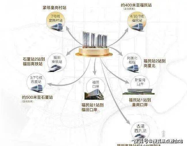 地铁:7 号线皇岗村站无缝接驳社区负一层,步行约 3 分钟可达;300 米内覆盖 4/10 号线福民站,500 米至 3 号线石厦站,四线交汇,2 站到皇岗 / 福田口岸,2 站达福田高铁站,3 站到岗厦北枢纽。