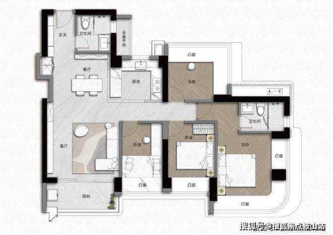 105㎡3+1 房两厅两卫:弹性方厅设计,可增设书房或儿童活动区;多飘窗拓展空间,兼顾功能性与性价比,适合首次改善。