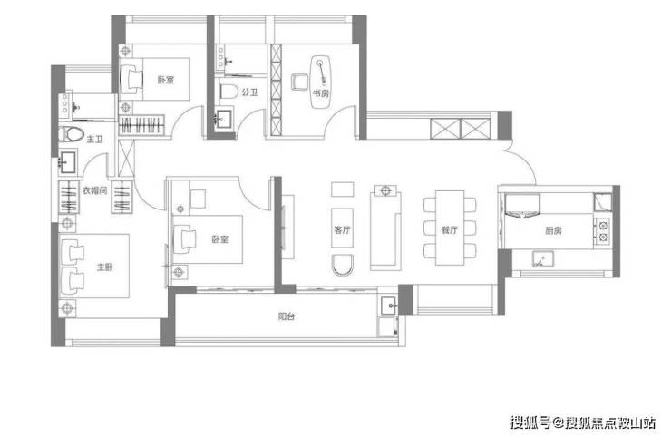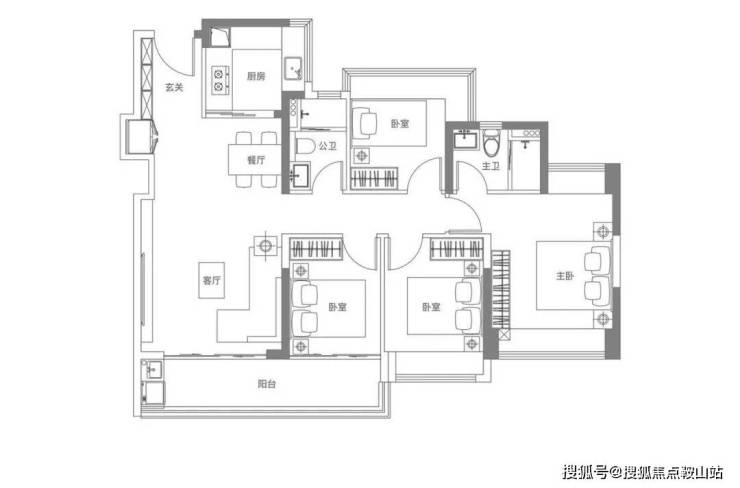 112㎡4房2卫:进门设有玄关,保障隐私与收纳需求。客厅开间达3.9m,LDKB一体化设计,动静分区合理。客厅连接次卧大阳台长6.5m。客厅,主卧、两个次卧四开间朝南,且主卧、次卧均带飘窗。主卧17㎡,次卧10.26㎡-9.06㎡-8.32㎡,得房率95%,东北-西南-东南朝向!