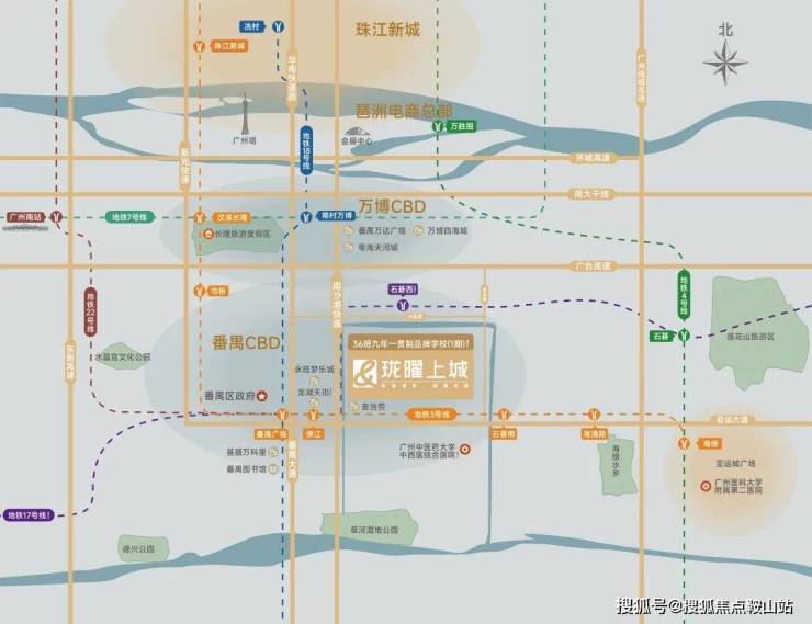 项目位于广州南拓中轴金脉之上,上联万博/琶洲/珠江新城,下联广州未来副中心南沙,承上启下,定鼎未来番禺生活新中芯。且项目近番禺区府板块,依托区府丰富资源和高级规划,具备无限发展潜力与优势。同时依托3号线东延线,于亚运大道经济带中轴线上,联动其他TOD集群+5大创新园区,以“TOD+轨道+产业+社区”发展模式,实现职住平衡,与千亿产业发展共生共荣。