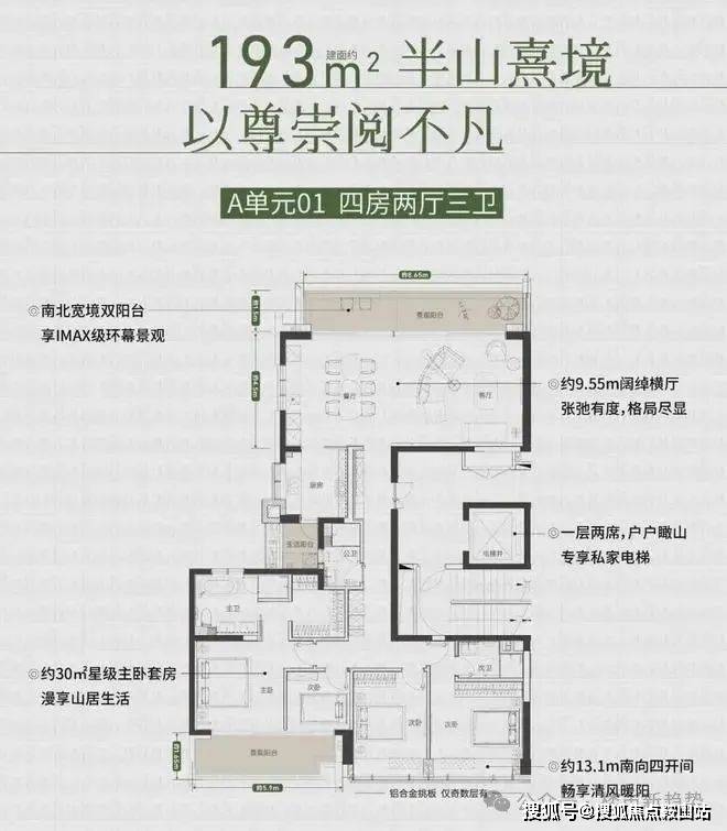 同样的专梯入户,豪宅感扑面而来,该户型为顶级大户型,四阳台设计,最大有10.55米的景观阳台和180度视野的餐客厅空间奢阔气场尽显,罕见的南北瞰景四阳台设计,让家的每个角落都能欣赏美丽的山景和城市景观。所有的开窗面都尽可能放大,客餐厅、书房、卧室、几乎都能享受超宽超大屏