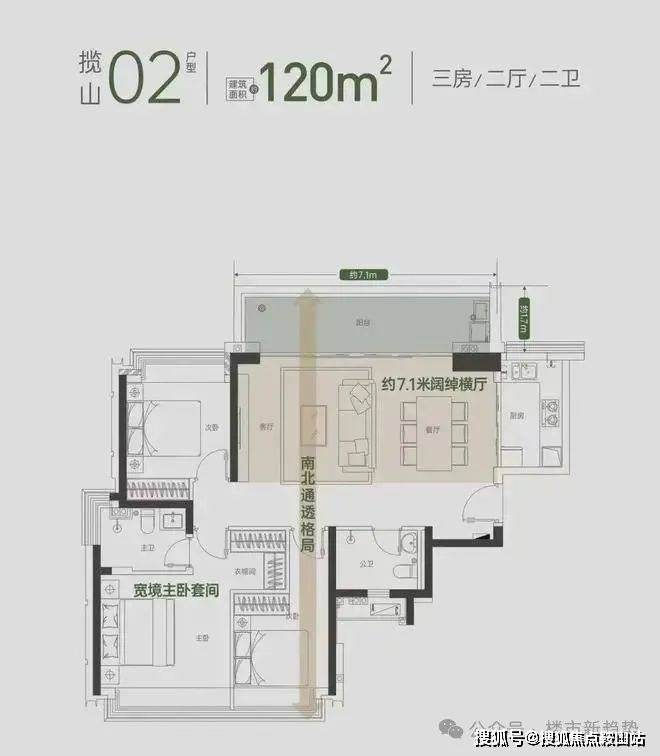 01/02户型 约120㎡3房2卫横厅:客厅阳台超7.1米,尺度很大,看向小区园林以及塘朗山山景,动静分离,户型方正视野开阔,属于居住体验非常阔绰的房型。约120平房源的北向视野,从2层开始就是满目的郁郁葱葱,20层以上俯瞰整个塘朗山,东南向视野更是集山景与繁华城市于一身。