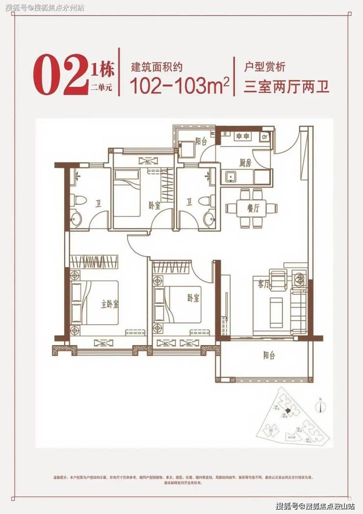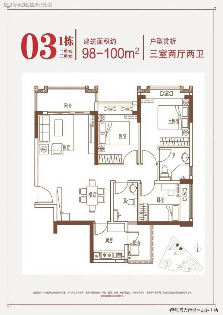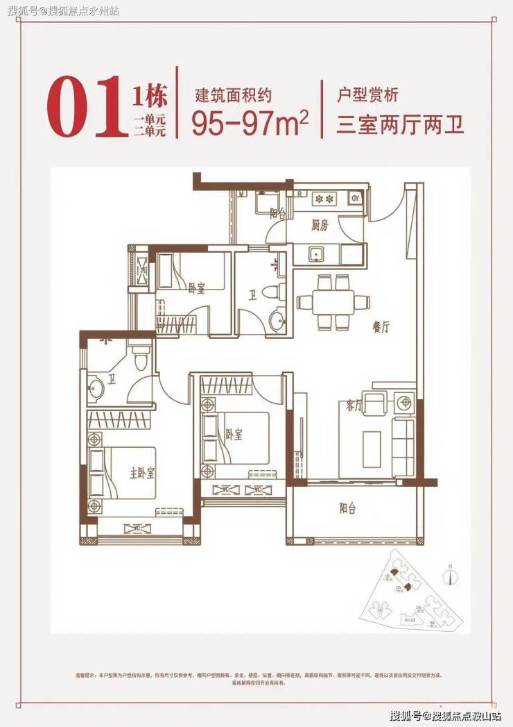 约95-97㎡三房两厅两卫:南向端头位,三面采光,可瞰花园景观,主卧带独立卫生间,总价416-494万。