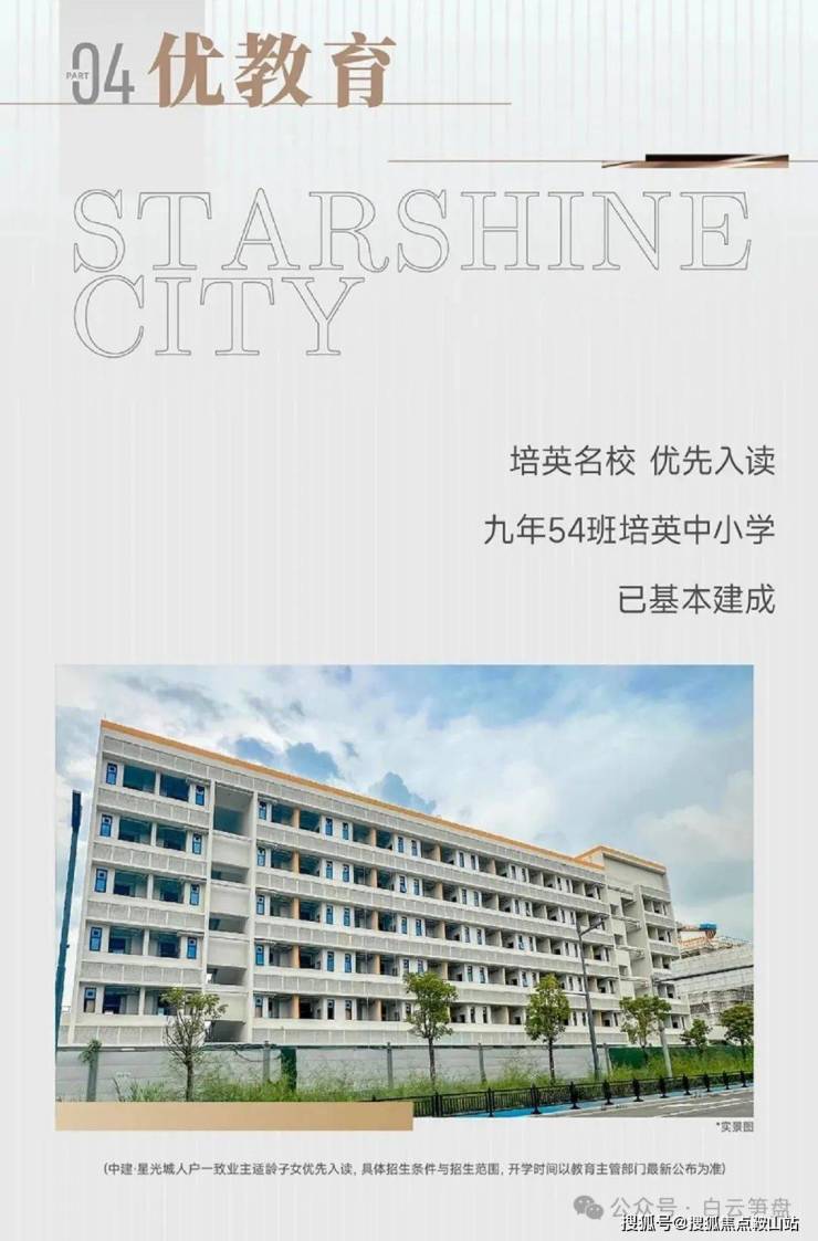 54班九年制培英中小学,公办性质,人户一致优先入读,可提供约1350个学位,中建·星光城业主适龄子女人户一致优先入读,约300米出家门入校门。