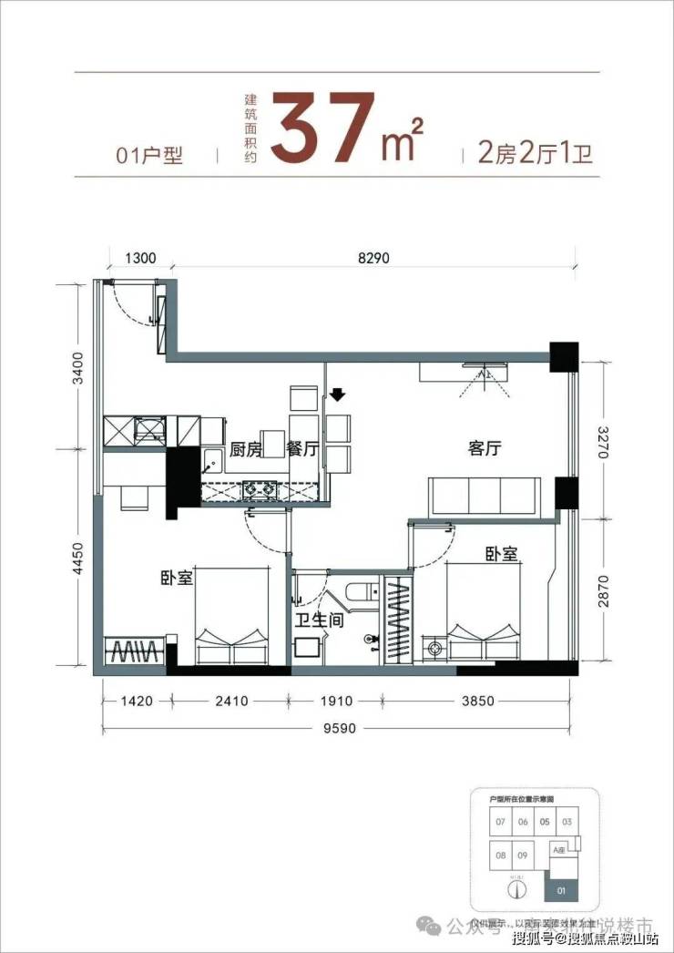 户型设计:项目主打37㎡两房户型,实际使用面积约54-64㎡(含赠送面积),分为两种类型: