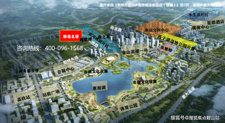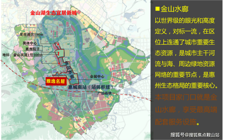 2019年6月市自然资源局发布《惠州市金山新城分区规划(草案)》,“金山新城”概念横空出世,惠州政府1年内5次叠加规划,规划出台3个月后即破土动工,更是将区域定位为:新生态、新中心、新引擎,大湾区生态立城的门户标杆,一流城市核心样板,可比肩深圳香蜜湖、东莞松山湖。