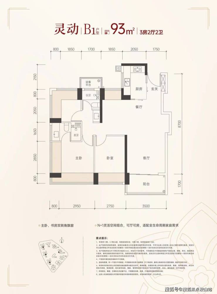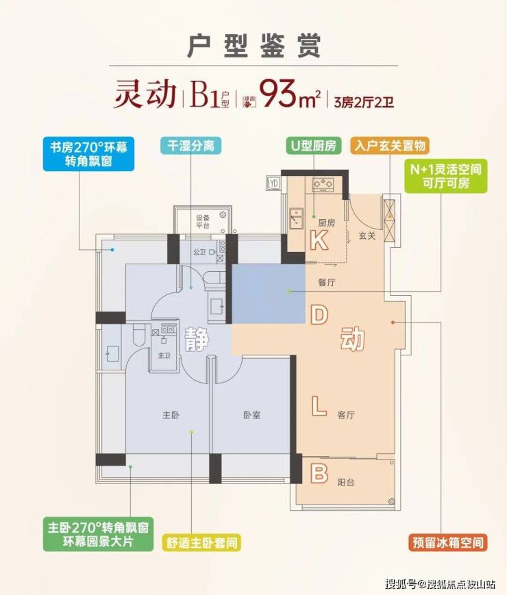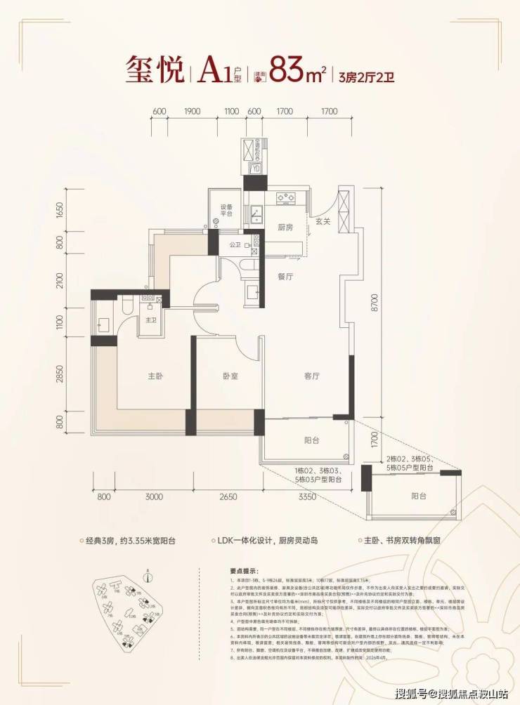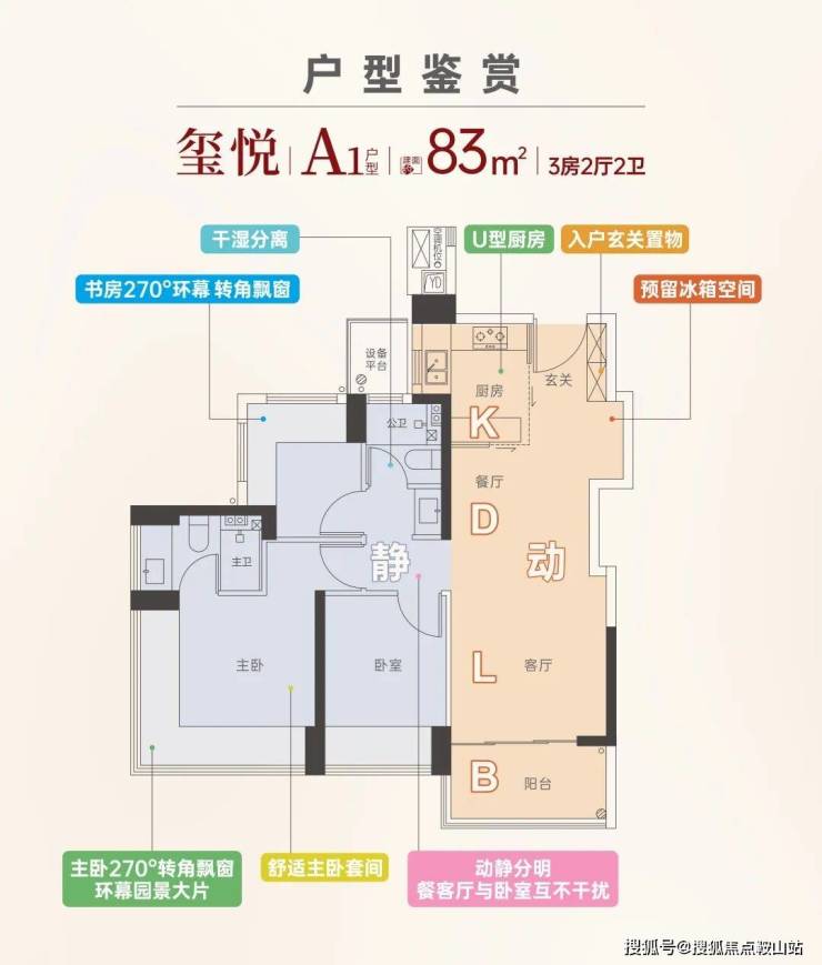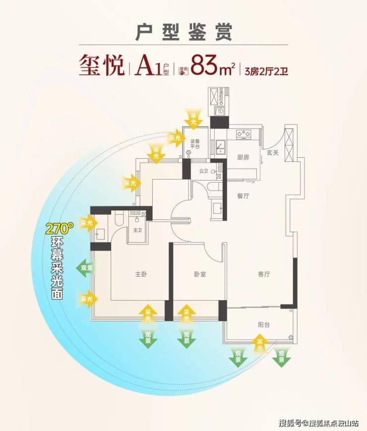 83㎡-3房2厅2卫,设计的是竖厅格局,客厅3.4米开间,LDKB一体化,S墙设计预留冰箱卡槽位,动静分区,主卧270°无柱转角飘窗,分别做到了主卧16.53㎡/次卧9.62㎡/次卧6.63㎡(包含墙体飘窗),U型厨房,公卫三段式干湿分离,还带1个设备平台,得房率约100%(包含赠送),首推的1/2栋东北朝向。赠送面积约13.74㎡。
