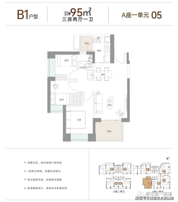 95㎡-3房2厅1卫,设计的是竖厅格局,客餐厅一体化,动静分区,L型厨房,带1个生活阳台,客厅阳台东南朝向。