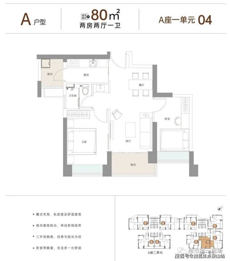 80㎡的2房2厅1卫,设计的是双龙抱珠格局,三开间朝南,一字型厨房,还带1个生活阳台,客厅阳台东南朝向。