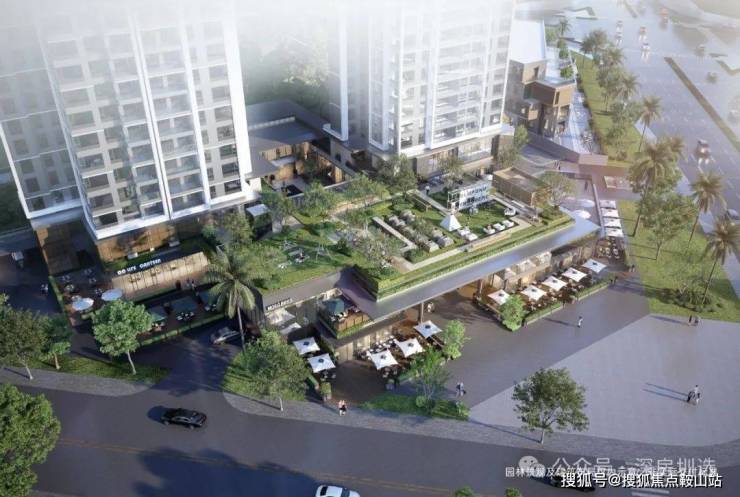 【抬高式檐上浮岛花园露台】:约1000㎡,位于商业街区顶层,业主私享花园露台,提供丰富空间活动区域,是邻里交流娱乐的理想场所。