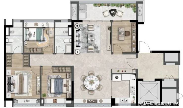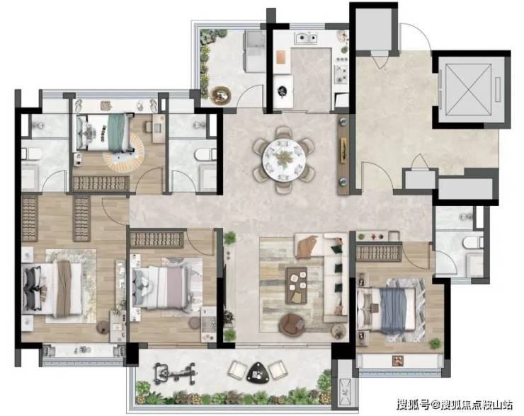 建面约 168㎡四房则是两梯两户,双主套设计,居住体验更加舒适。