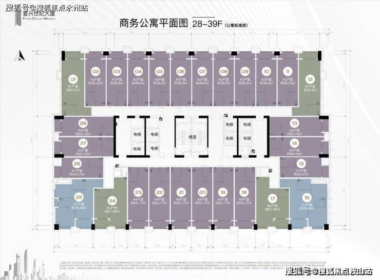 公寓8梯28户,办公6梯15户,商业4梯34户