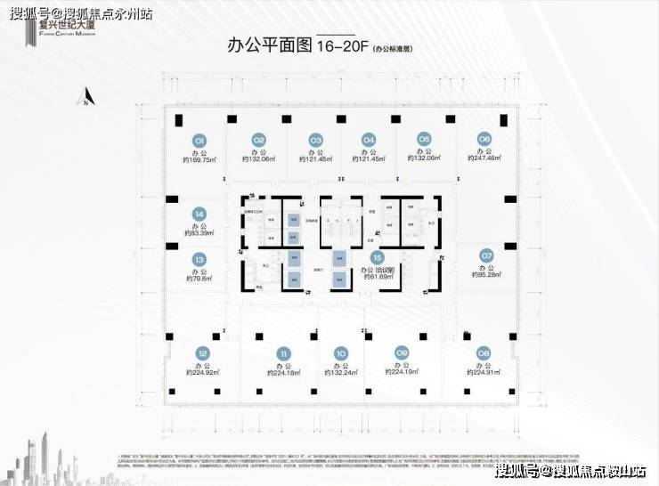 办公产品:建面61㎡-2300㎡,可自由组合,楼层15-20层,层高4米,办公环境宽敞明亮,6梯15户,高效便捷