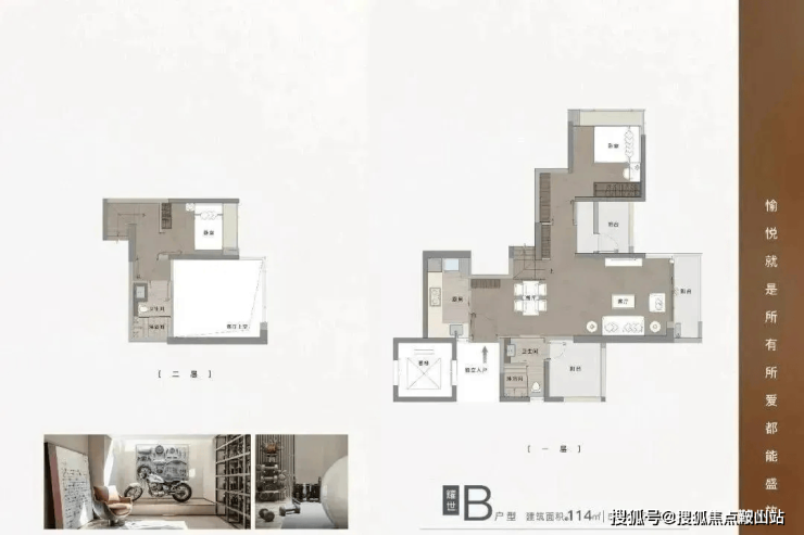 114㎡复式户型看上去就实用很多,因为项目是2018年报建的,那时还没禁复式令,所以耀胜尊府这个是真复式,得房率非常高。