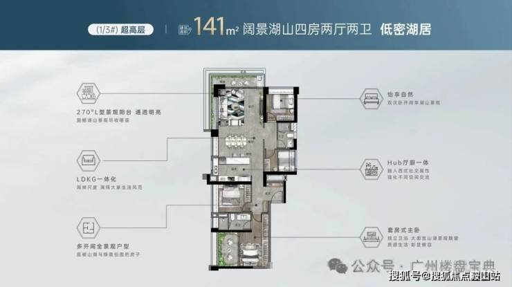 建面141平四房,LDKG一体化设计,270°飘窗把湖景尽收眼底。