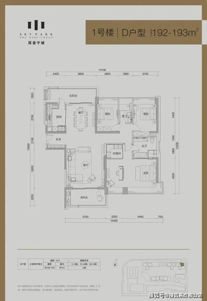 1栋:产品是面积段为137-185-192㎡的3房、212㎡的4房、以及4套300㎡以上的顶层复式单位,其中36层及以下为2梯3户“品”字形结构,37层及以上为2梯2户的板楼结构;