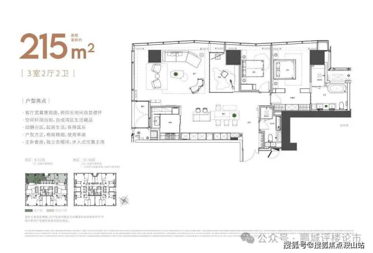 大平面大尺度定位,层高约3.6米,横厅设计确保奢阔观景面,全户型纵享环幕视野。项目打造建面约215-620㎡纯粹品质公寓,顶层为建面约1270㎡公寓产品。