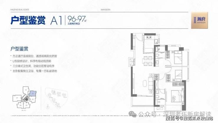 03/05/06(A2/A3)户型,竖厅三开间朝南格局,客厅3.5米开间,LDKB一体化,S墙设计预留冰箱卡槽位,主卧+1个次卧双飘窗。得房率约78%(不含赠送)。