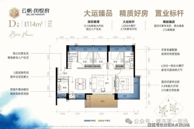114㎡4房2厅2卫:设计的是经典大横厅格局,LDKB一体化6.9米开间,进门入户玄关,客厅带5.2米大阳台,U型厨房,主卧南北通透270度景观,卫生间干湿分离。