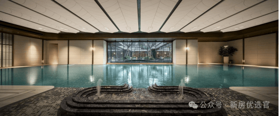 恒温泳池:第一,采用了景德镇烧制的陶瓷马赛克,独特的釉面色彩由景德镇老师傅手工浇筑而成,充满人文艺术底蕴;第二,羽毛天花造型,由600余件铝板打造,表面采用了仿贝壳纹的艺术漆处理,带来松弛度假感;第三,不仅配置了约25m×10m的4道泳池,还采用了奥运会同款空调除湿系统,彰显高档品质细节!