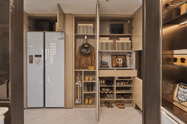 从 5大收纳区的镂空玄关柜,到分类更细致的卫浴空间,再到 厨房的5大分区,以及更惊喜的 餐边柜,划分6大功能区,全屋收纳量飙升!