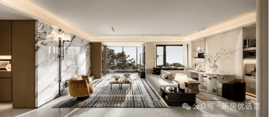 室内空间:引入了全屋智能家居系统,能通过App、中控、语音三大方式,调节全屋智能家居,包括客厅灯光、空调、地暖、新风、客厅和主卧窗帘等场景。