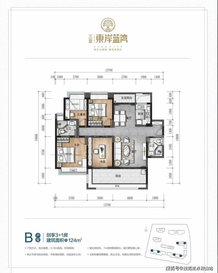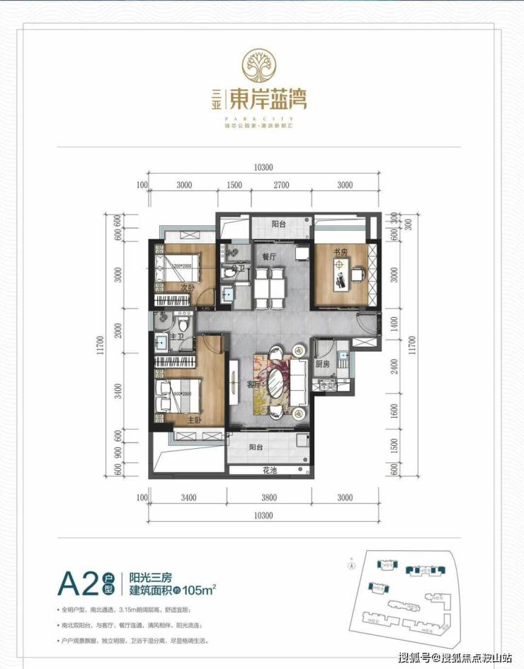 项目基本信息开发商:海南和鑫地产开发有限公司地址:三亚市总部经济及中央商务启动区东岸单元总占地:约31000㎡总建面:约110000㎡产品:住宅102-143㎡三至四房,16-144㎡临街旺铺总户数:住宅702户,商铺31户车位数:850个(地上:146个,地下:704个)层数:22-24层住宅梯户:两梯两户、两梯四户住宅户型:102-105㎡|3房2厅2卫124㎡|3+1房2厅2卫143㎡|4房2厅2卫产权:住宅70年,商铺40年容积率:2.5绿化率:约40%交付标准:住宅精装交付,商铺毛坯