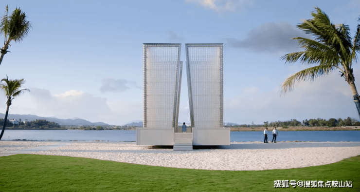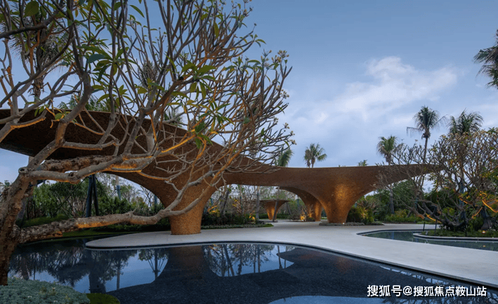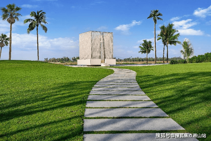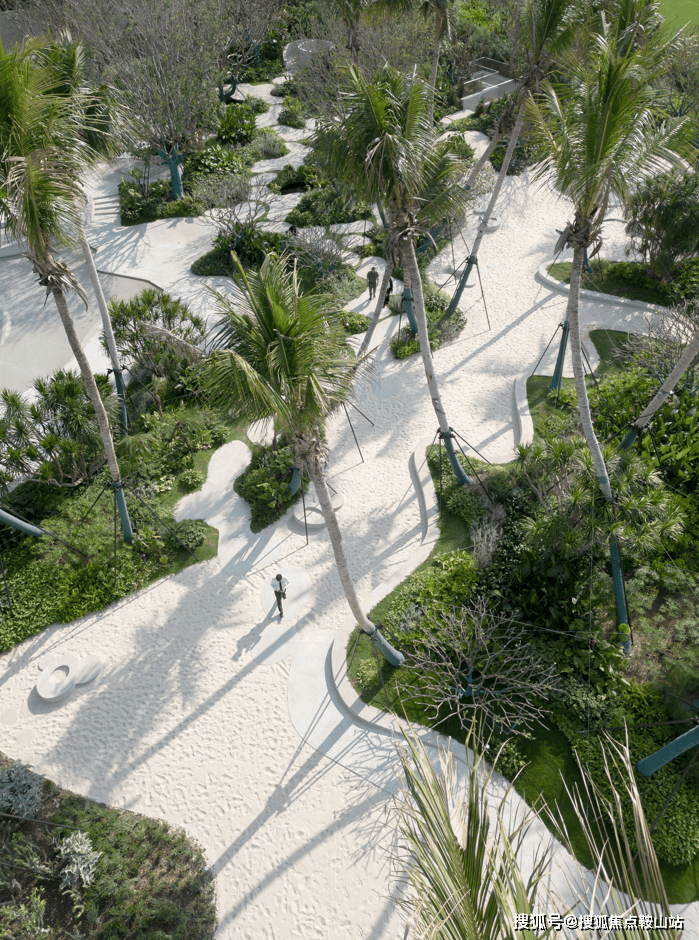 在重塑海棠河生态公园的规划体系下,近 9 万平方米的示范区延续公共自然风情。主入口设置超大雨树和沙生植物,车行道两侧的原生大雨树形成夹道空间。项目依据三亚原始地貌增加地形起伏,打造类果岭系统,落客区沙生植物夹道、伞状廊架等展现度假风情。儿童戏水区模拟海浪和沙滩,“一盏灯” 景观装置加深场地记忆。