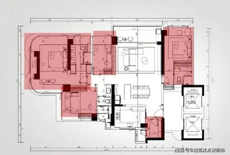 单元楼近1:1梯户比,分区设置电梯厅,类似于华润城润玺,北区大户型双电梯独立电梯厅入户,南区3梯4户。