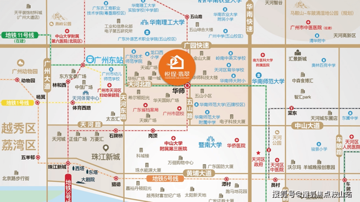 1、地铁:广州地铁3号线,10号线,11号线三线交汇,华师站距离项目仅300米,2站到广州东站、4站到珠江新城、5站到广州塔;