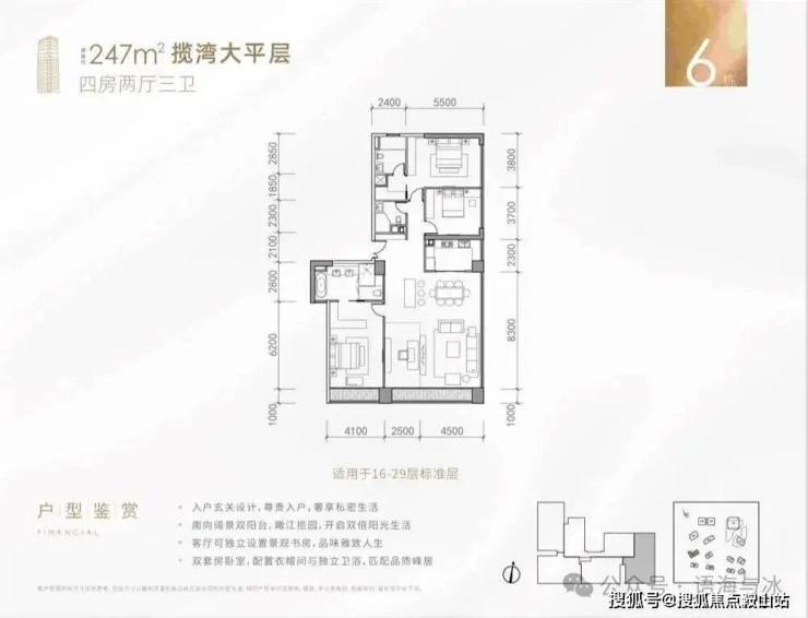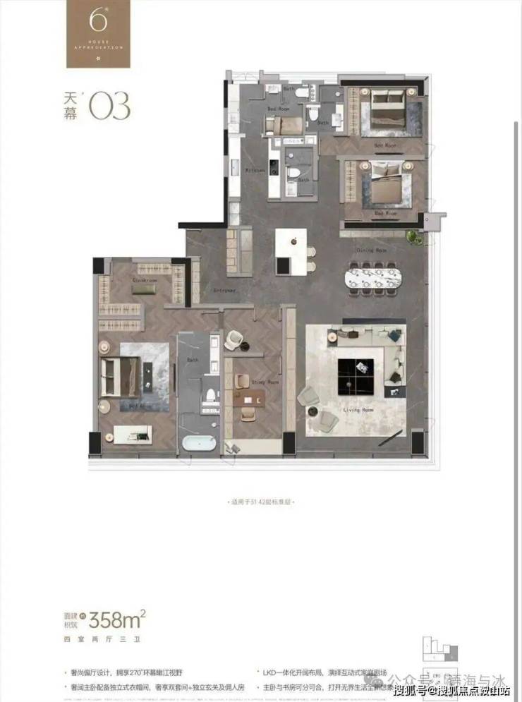 产品方面,项目提供多样化高端住宅配置,满足不同层级的生活需求。叠墅产品位于7栋与10栋,面积区间240-310㎡,为城市中轴线上罕有的南向首排一线江景叠墅,空间层次丰富,居住私密性强;大平层分布于6栋高区至低区,面积段覆盖79-400㎡,其中高区单位具备270°观景视野,尽揽珠江壮阔与小蛮腰天际;中低区单位则打造实用型江景住宅,面宽设计极致优化,5开间朝南,13米以上阳台面宽,营造超阔观江视界。loft公寓位于5栋,面积段为41-110㎡,买一层送一层,精装交付,是市场稀缺的投资型优质产品。另配备写字楼产品,单层面积达1060㎡,整体约4万㎡,匹配城市总部级办公需求,成就金融城商务新地标。