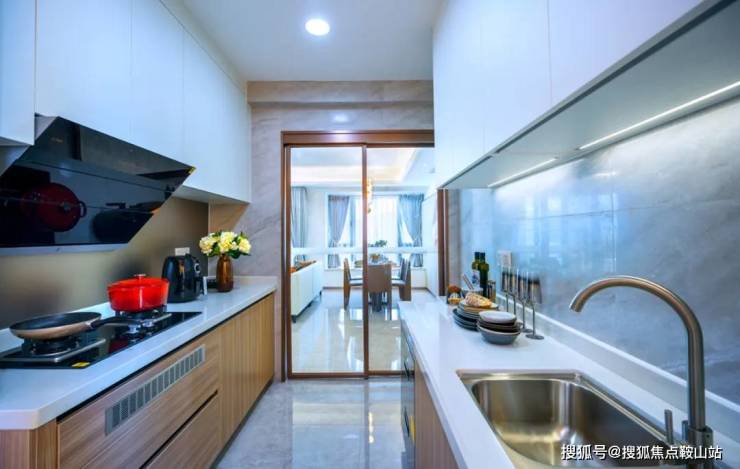 厨房配备欧派定制整体厨柜,整洁大方。配置方太厨电3件套,炉台背景墙特别304防指纹沙面不锈钢材质设计,顶部LED暧光照明灯带