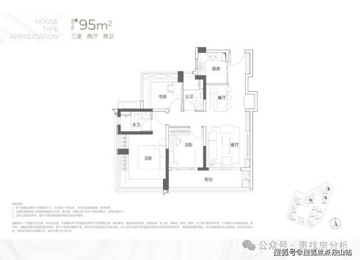 95㎡的3房2厅2卫:传统竖厅格局,客厅开间3.5米,LDKB一体化,S墙设计预留冰箱卡槽位,3个卧室分别做到了3.6米/2.8米/2.8米的宽度,主卧加1个次卧270°全景飘窗,客厅连接次卧出6.3米长的大阳台,U型厨房,得房率约95-97%(包含赠送),西南或东北朝向。户型分布在2栋2/3单元04/05户型,东北朝向看大南山、2栋1单元04/05户型西南朝向看小区;