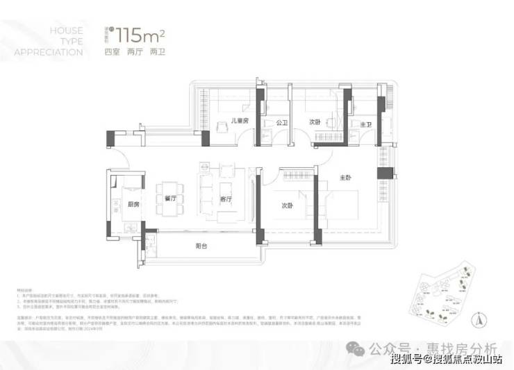 115㎡的4房2厅2卫:横厅南北通透格局,客餐厅6米开间,LDKB一体化,全屋飘窗,4个卧室分别做到了3.9米/3米/2.8米/2.6米的宽度,主卧加1个次卧270°全景飘窗,客厅出6米长的大阳台,L型厨房,得房率约95-97%(包含赠送),西南或东南朝向。115平米户型分布在1栋1单元、1栋2单元、1栋3单元01/02户型,01户型西南朝向都是看小区外围,02户型看向小区;