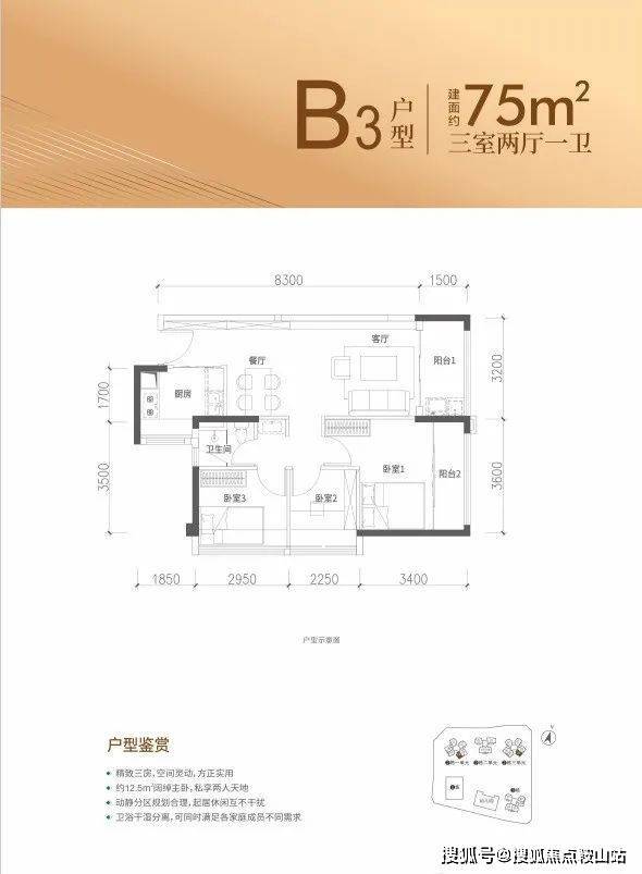 特点:LDKB一体化设计,主卧13.24㎡(含飘窗),次卧8.85㎡(含飘窗),次卧6.75㎡(含飘窗)。