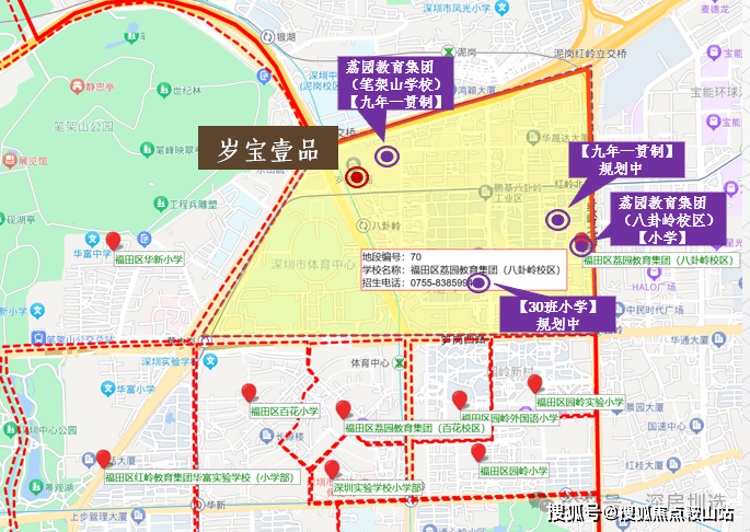 5、教育氛围——荔园教育集团(八卦岭校区)已于2022年9月开学,是本项目的临近学校,且项目西侧由岁宝代建的荔园教育集团(笔架山学校)计划2024年竣工,项目北侧为深圳中学,整个片区教育氛围浓厚。本项目临近之学校的申请学位及落户条件以政府(包括但不限于教育主管部门)颁布的政策及学校规定为准,开发商不做任何承诺。