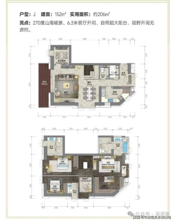 ★152㎡复式三套房两厅四卫+双功能房 双向通透三面采光,尽赏深圳湾景观,6.3米开间,三套房设计,两间多功能房满足个性化使用。